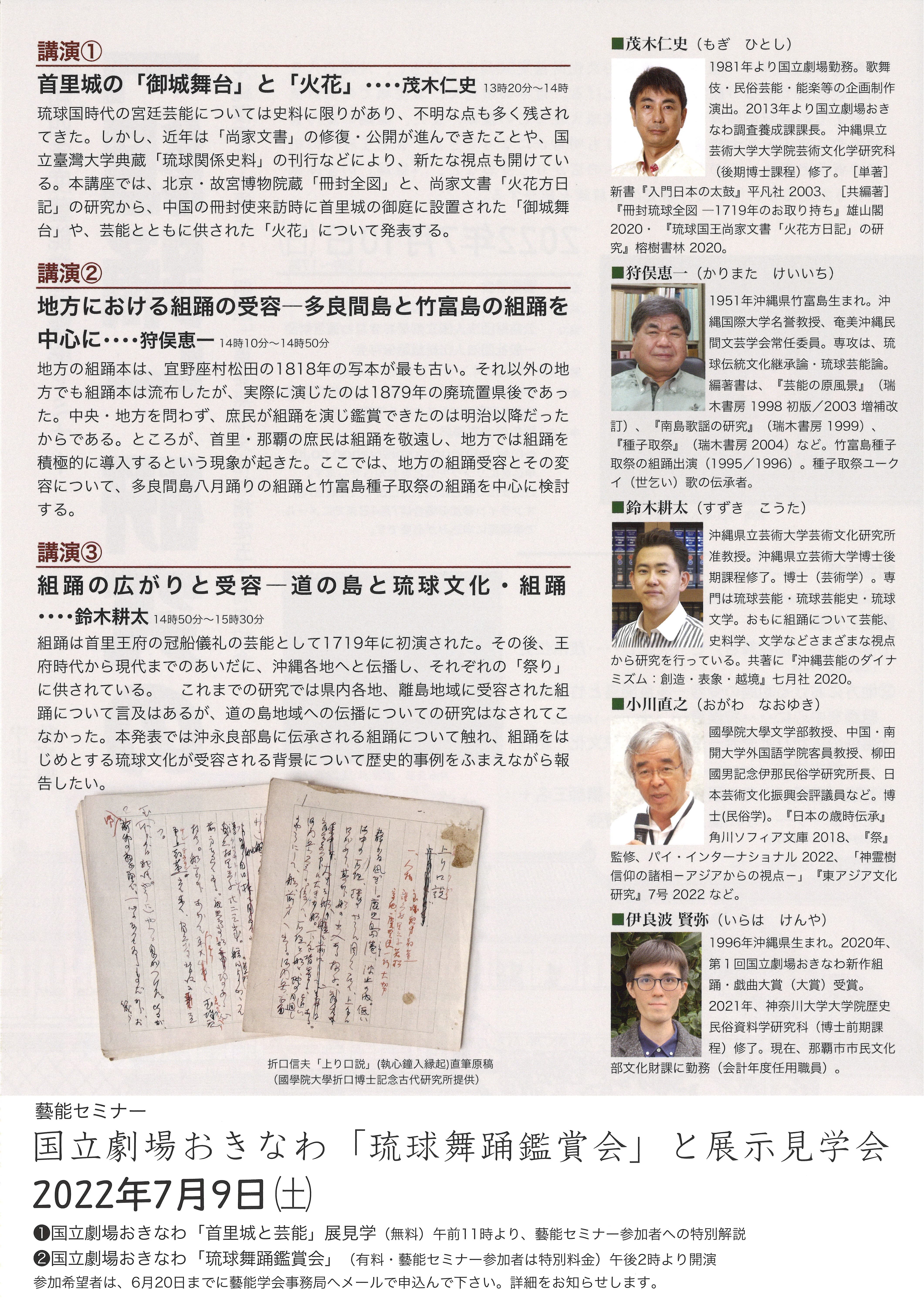芸術文化研究所共催藝能学会セミナー「「組踊」研究の現在」の開催について