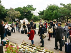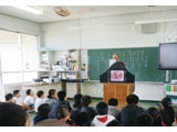 芸大講師・学生が那覇空港を出発し宮古空港へ。宮古島平良港からフェリーで乗り継ぎ伊良部島佐良浜港へ。バスにて約10分ほどで佐良浜小学校に到着!この後すぐ、旅の荷物を控室に預け、各教室の準備をし開講式を行いました。(画像:佐良浜小学校校庭)