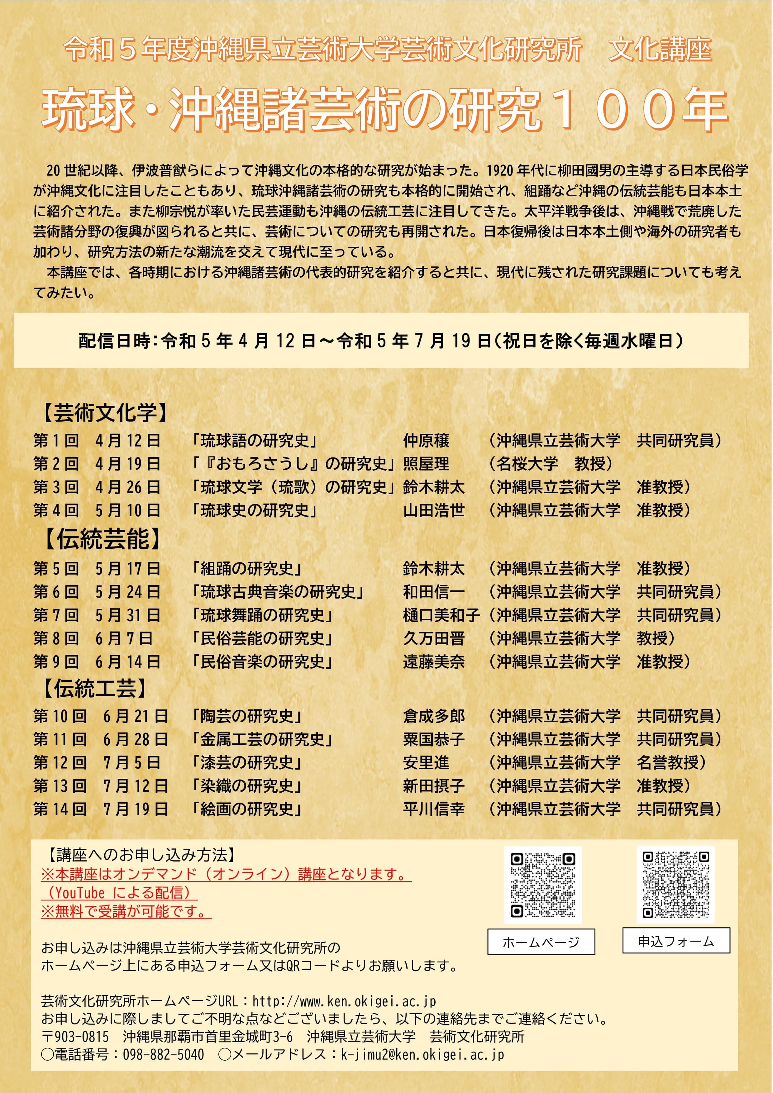 本講座では、各時期における沖縄諸芸術の代表的研究を紹介すると共に、現代に残された研究課題についても考えてみたい。