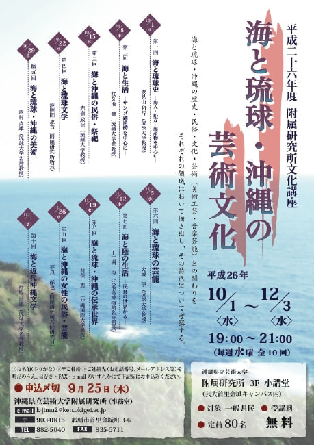 その、具体相を歴史・民俗・文学・芸術(美術工芸・音楽芸能)などの諸領域から描き出し、海と琉球・沖縄の芸術文化のかかわりについて考察する。そして、私たちの地域が未来にわたって、海とどのように関わっていくべきかを考えるよすがとしたい。