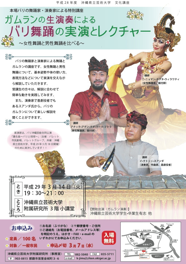 実演家は、バリ沖縄芸能合同公演「踊る島〜バリと琉球〜」(主催:パレット市民劇場、パレットグループ。共催:沖縄県立芸術大学。平成29年3月18日開催)のために来沖しています。