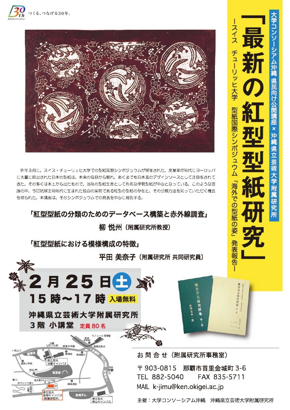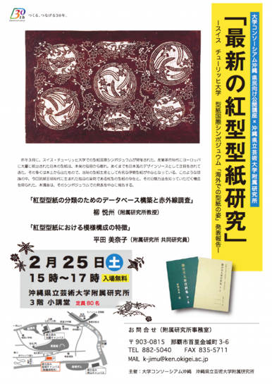 昨年3月に、スイス・チューリッヒ大学での型紙国際シンポジュウムが開催された。産業革命時代にヨーロッパに大量に輸出された日本の型紙は、本来の役目から離れ、あくまでも日本風のデザインソースとして注目をされてきた。その多くは本土から出たもので、当時の型紙生産として有名な伊勢型紙が中心となっている。このような認識の中、今回琉球王朝時代に生まれた独自の染物である紅型の型紙の存在と、その分類方法を知っていただく機会を得られた。本講座は、そのシンポジュウムでの発表を中心に報告する。