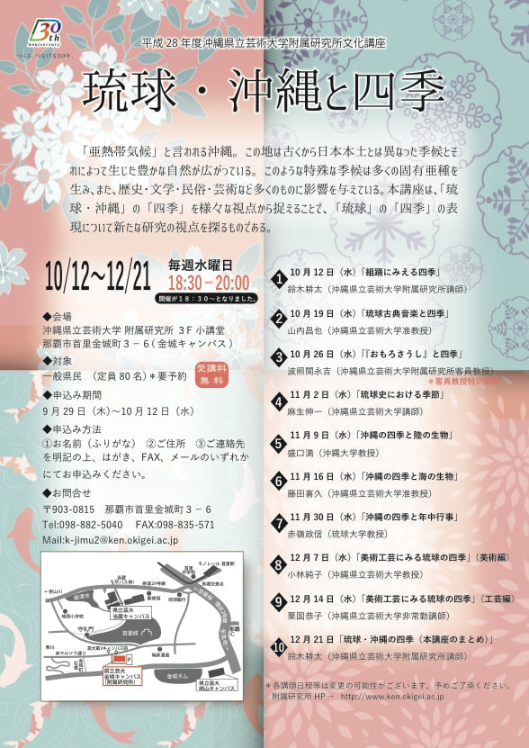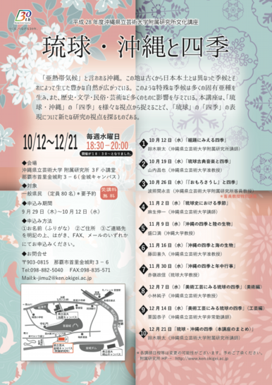 「亜熱帯気候」と言われる沖縄。この地は古くから日本本土とは異なった季候とそれによって生じた豊かな自然が広がっている。このような特殊な季候は多くの固有亜種を生み、また、歴史・文学・民俗・芸術など多くのものに影響を与えている。本講座は、「琉球・沖縄」の「四季」を様々な視点から捉えることで、「琉球」の「四季」の表現について新たな研究の視点を探るものである。