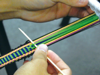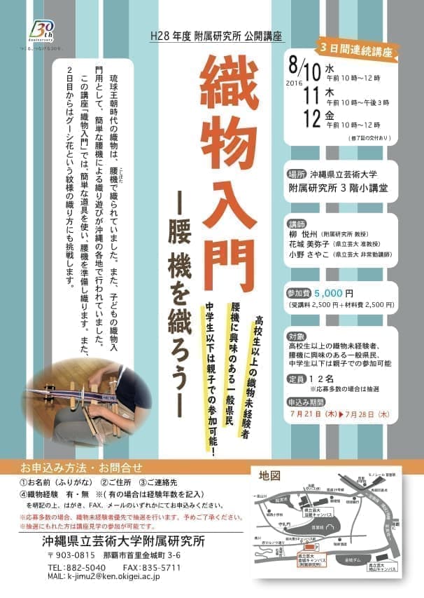 琉球王朝時代の織物は、腰機で織られていました。また、子どもの織物入門用として、簡単な腰機による織り遊びが沖縄の各地で行われていました。この講座「織物入門」では、簡単な道具を使い、腰機を準備し織ります。また、2日目からはグーシ花という紋様の織り方にも挑戦します。