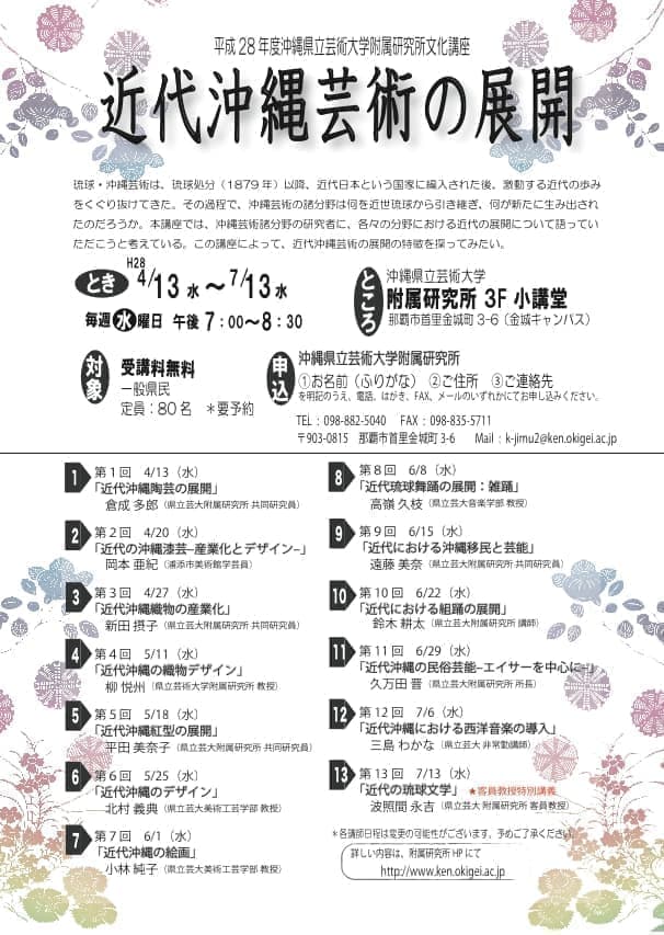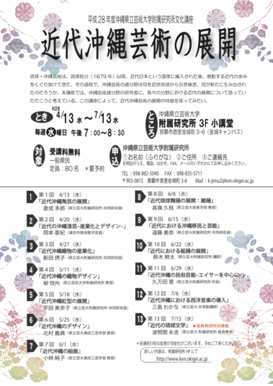 琉球・沖縄芸術は、琉球処分(1879年)以降、近代日本という国家に編入された後、激動する近代の歩みをくぐり抜けてきた。その課程で、沖縄芸術の諸分野は何を近代琉球から引き継ぎ、何が新たに生み出されるのだろうか。本講座では、沖縄芸術諸分野の研究者に、各々の分野における近代の展開について語っていただこうと考えている。この講座によって、近代沖縄芸術の展開の特徴を探ってみたい。