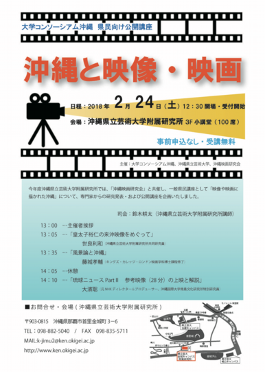 今年度沖縄県立芸術大学附属研究所では、「沖縄映画研究会」と共催し、一般県民講座として「映像や映画に描かれた沖縄」について、専門家からの研究発表・および公開講座を企画いたしました。