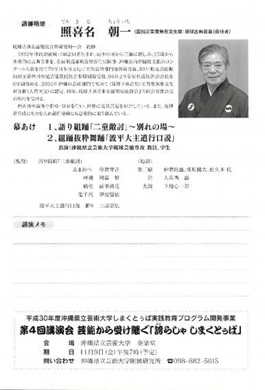 ウチナー芝居の名優による講演と芝居の上演を通して、芝居の喜怒哀楽や芝居の裏話等「しまくとぅば」でしか伝える事の出来ない言葉を受け継ぎます。