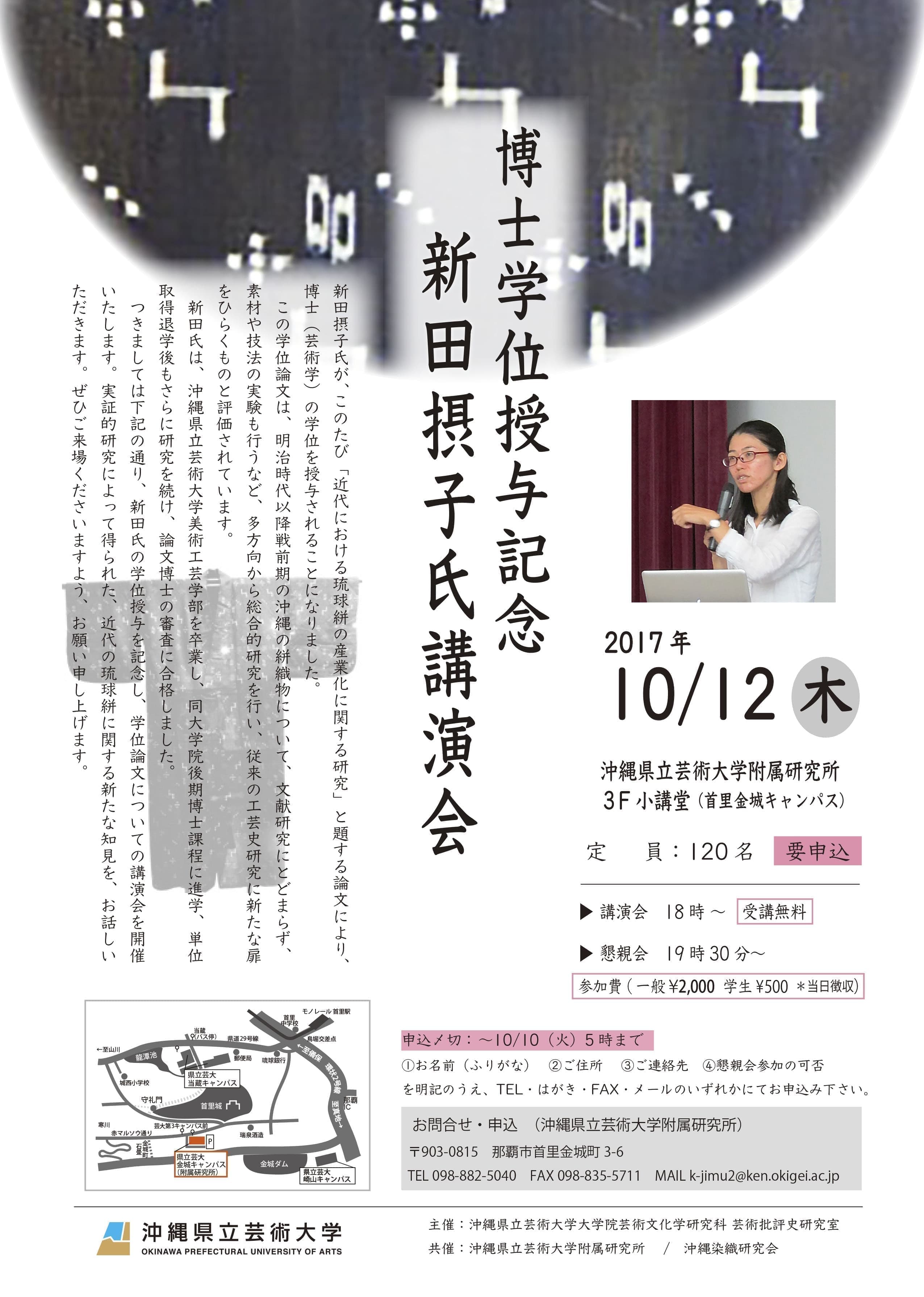 新田摂子氏が、このたび「近代における琉球絣の産業化に関する研究」という論文により博士(芸術学)の学位を授与されることになりました。明治から戦前期の沖縄の絣織物について、文献研究にとどまらず、実証的な研究も行うなど、多方向からの研究は従来の工芸史研究に新たな扉をひらくものと評価されています。同氏は、本学博士課程芸術批評史研究室出身の初の博士学位授与者であるとともに、本学美術工芸学部工芸専攻の卒業生でもあります。同氏の学位授与を記念し、学位論文について講演会を開催します。