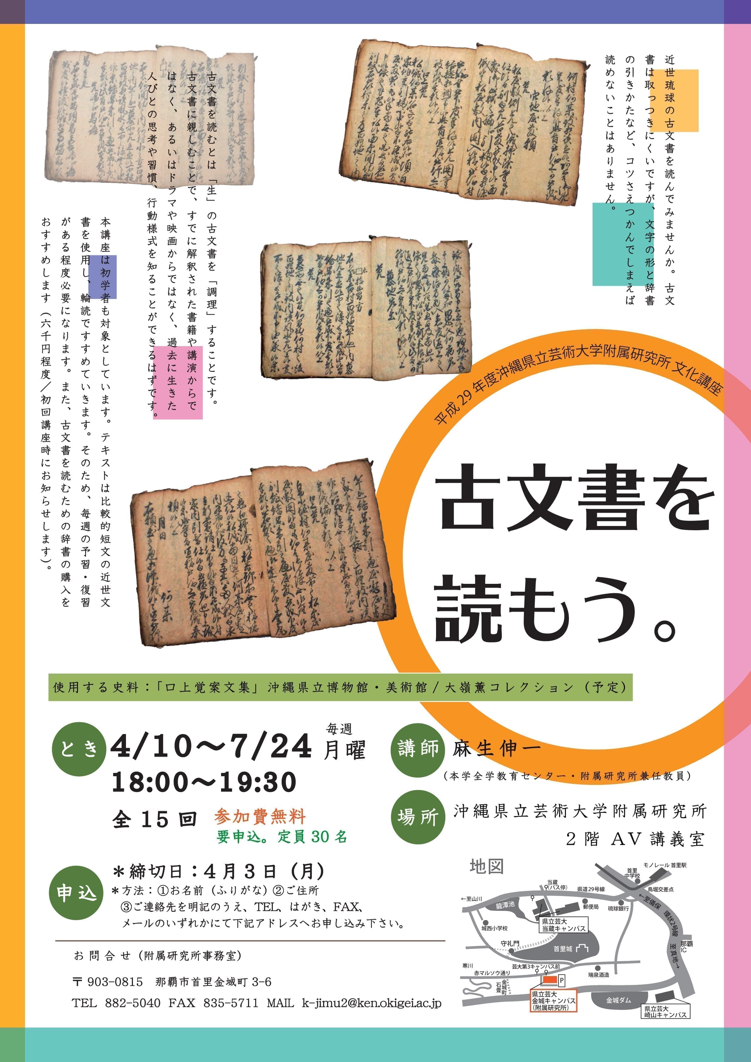 近世琉球の古文書を読んでみませんか。古文書は取っつきにくいですが、文字の形と辞書の引きかたなど、コツさえつかんでしまえば読めないことはありません。古文書を読むとは「生」の古文書を「調理」することです。古文書に親しむことで、すでに解釈された書籍や講演からではなく、あるいはドラマや映画からではなく、過去に生きた人びとの思考や習慣、行動様式を知ることができるはずです。