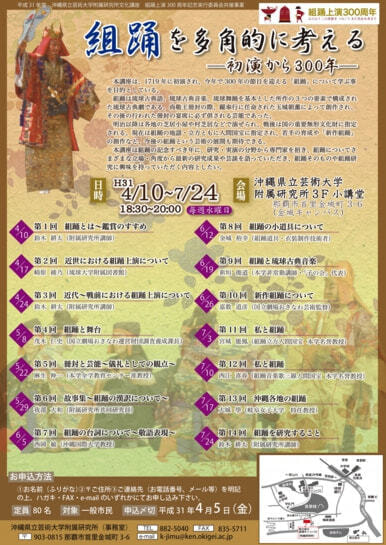 本講座は組踊の記念すべき年に、研究・実演の分野から専門家を招き、組踊についてさまざまな立場・角度から最新の研究成果や芸談を語っていただき、組踊そのものや組踊研究に興味を持っていただく内容としたい。