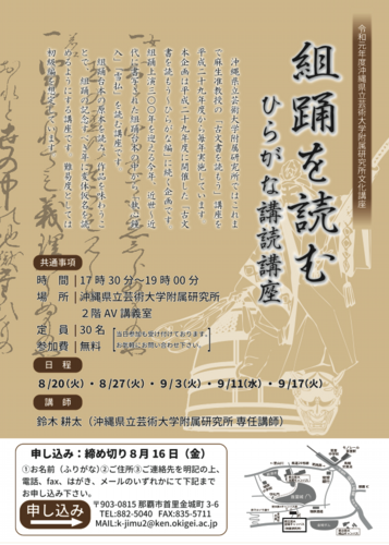 沖縄県立芸術大学附属研究所ではこれまで麻生准教授の「古文書を読もう」講座を平成二十九年度から毎年実施しています。本企画は平成二十九年度に開催した「古文書を読もう〜ひらがな編」に続く企画です。組踊上演三〇〇年を迎える今年、近世〜近代に書写された組踊台本の中から「執心鐘入」「雪払」を読む講座です。