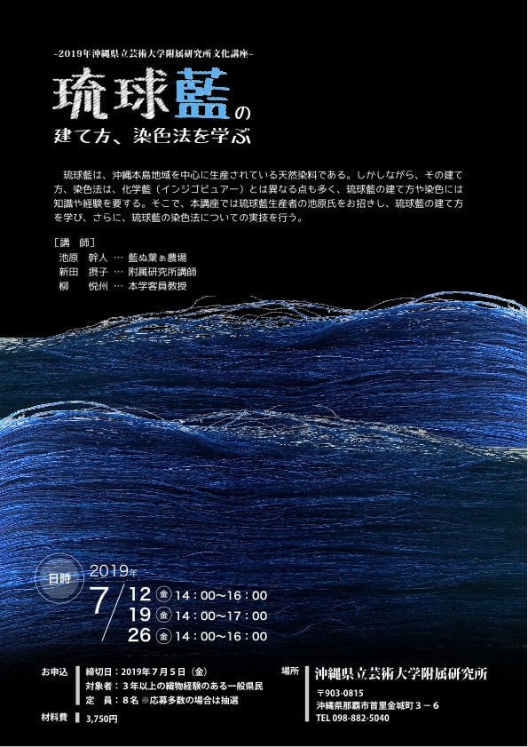 そこで、本講座では琉球藍生産者の池原氏をお招きし、琉球藍の建て方を学び、さらに、琉球藍の染色法についての実技を行う。