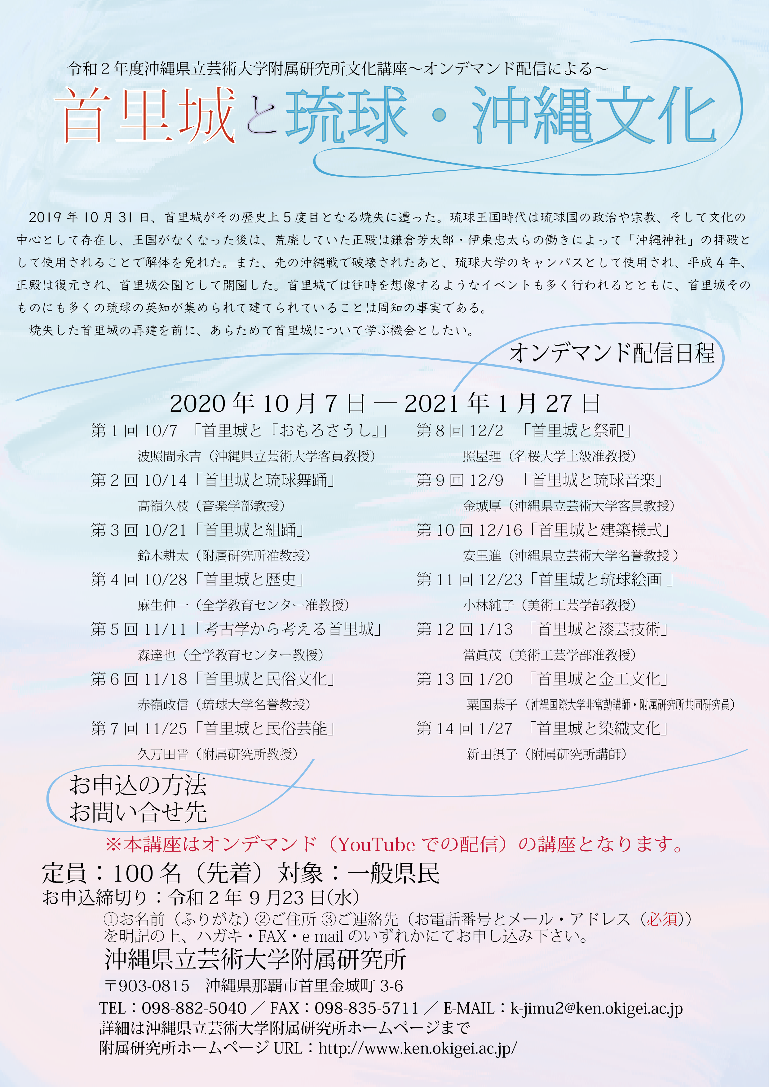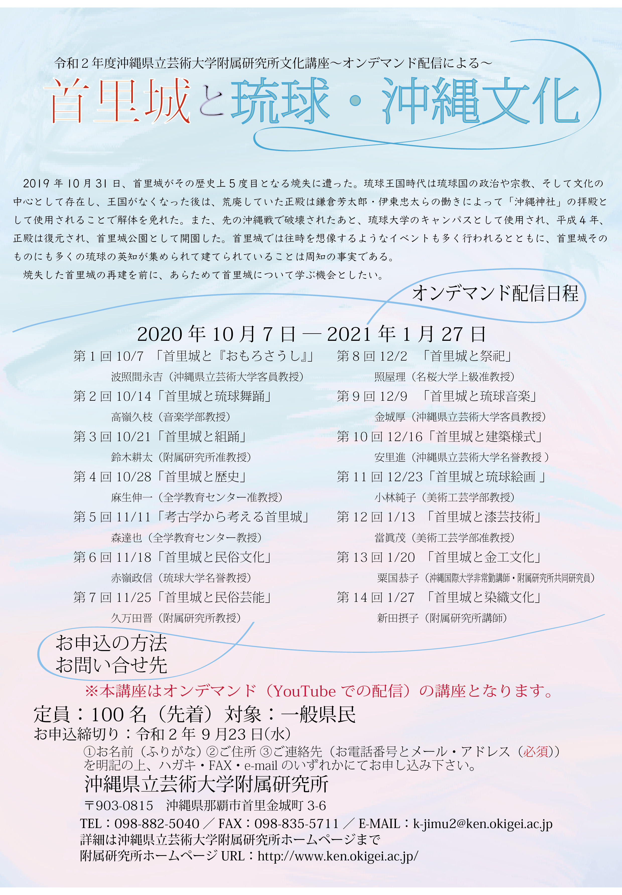 ※文化講座「首里城と琉球・沖縄文化」は令和2年4月8日より沖縄県立芸術大学附属研究所3階小講堂で開催が予定されていたが、COVID-19の影響によりオンデマンド開催に変更。動画の撮影は講師各自の環境、もしくは附属研究所2階AV講義室にて実施された。